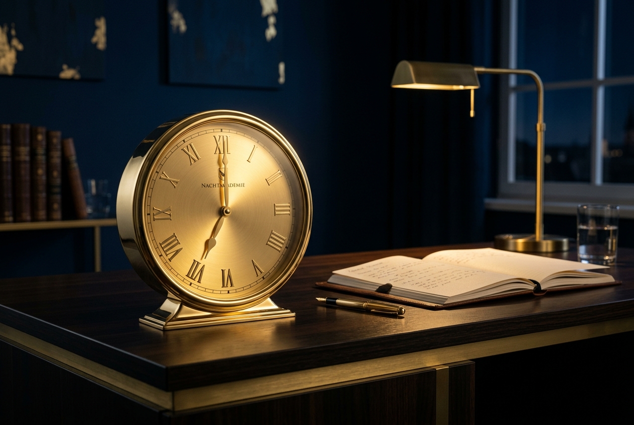 Der Deckenlampen-Fehler. Zwei Teilnehmende saßen unter grellem Deckenlicht — 6500 Kelvin, Vollgas. Um Mitternacht waren sie sichtbar erschöpft, obwohl die anderen noch fit waren. Ihr Gehirn bekam das Signal „Tag“, während der Körper bereits auf Nacht umgestellt hatte. Seit diesem Seminar ist eine einstellbare Lampe mit regulierbarer Lichttemperatur Pflicht und Bestandteil des Nachtakademie Startersets. Das Deckenlicht lassen wir aus.