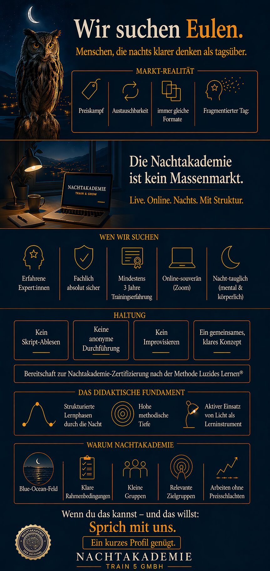 Ein Tageskonzept einfach in die Dunkelheit zu verschieben, wäre fahrlässig. Wer Menschen in der Nacht schult, trägt eine besondere Verantwortung — für ihre Gesundheit, ihren Biorhythmus und die Qualität ihres Lernens. Die Zertifizierung zum Nachtakademie™-Trainer bildet eine völlig neue didaktische Disziplin aus.